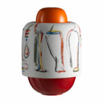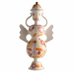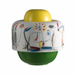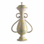 Clay vase, hand thrown. Matte finish on the central body, with hand painted illustrations featuring matte and glossy details. Base and lid in glossy glaze.